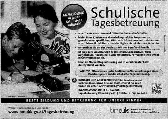 In der Tageszeitung „Österreich“ vom 25. Jänner 2013 ist auf Seite 26 ein Inserat des BMUKK mit dem Titel „Schulische Tagesbetreuung“ zu finden.
