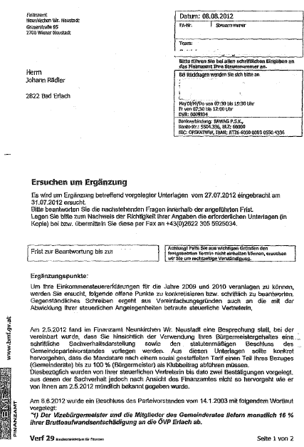 Laut uns zugegangenen Informationen hat der Abgeordnete und Bürgermeister Johann Rädler im Zuge seiner Einkommensteuererklärungen wiederholt gegenüber dem Finanzamt angegeben, dass er sein gesamtes Bürgermeistergehalt als Klubbeitrag abführt und es daher nicht in die Berechnung der von ihm abzuführenden Steuer einzuberechnen sei.