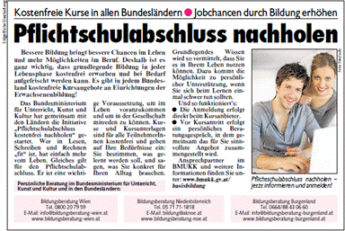 In der Tageszeitung „Krone“ vom 26. März 2013 ist auf Seite 15 ein Inserat des BMUKK mit dem Titel „Pflichtschulabschluss nachholen“ zu finden.