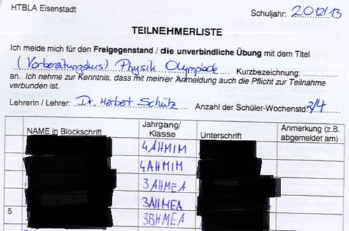 So lautete Ihre Beantwortung ua, dass an der HTL Eisenstadt bei der Anmeldung für unverbindliche Übungen und Freigegenstände keine Unterschriftenlisten zur Anwendung kommen, was eindeutig unrichtig ist. Im Folgenden ein Ausschnitt aus der geschwärzten Unterschriftenliste für den Vorbereitungskurs Physikolympiade. (Ein ungeschwärztes Exemplar liegt der FPÖ vor.)