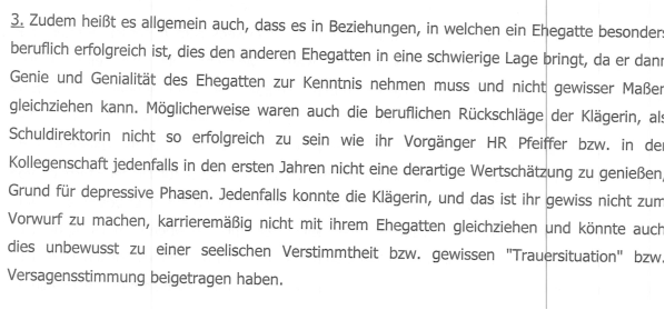 Die Schuldirektorin der HLW Biedermannsdorf ist seit Mai 2010 wegen eines schweren Burn Out im Krankenstand und hat den dadurch erlittenen Schaden mit einer Amtshaftungsklage gegen den Bund geltend gemacht. In der von Bundesministerin Dr. Claudia Schmied im Einvernehmen mit der Finanzprokuratur erstellten Klagebeantwortung – die letztlich von Bundesministerin Dr. Claudia Schmied zu verantworten ist – wurde der Klägerin die Vermutung entgegen gehalten, sie sei an der „Genialität ihres Gatten gescheitert“ und deshalb krank. Wir dürfen Ihnen die entsprechende Äußerung aus der Klagebeantwortung zur Kenntnis bringen: