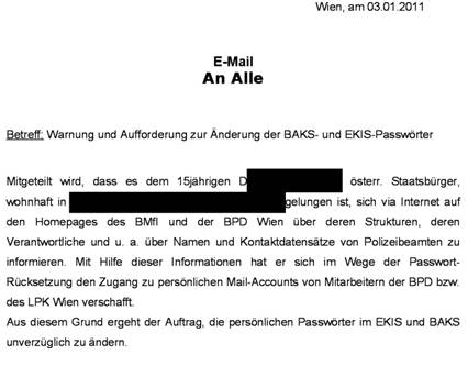 „Soweit das derzeit beurteilt werden kann, geht es um E-Mails von einem Mitarbeiter des Innenministeriums. Dieser E-Mail-Verkehr betrifft keine sensiblen oder weiterverwertbaren Daten“, erklärte Innenministeriumssprecher Karl-Heinz Grundböck der APA. (…)“