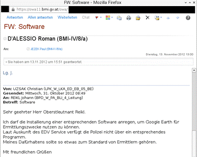 „Soweit das derzeit beurteilt werden kann, geht es um E-Mails von einem Mitarbeiter des Innenministeriums. Dieser E-Mail-Verkehr betrifft keine sensiblen oder weiterverwertbaren Daten“, erklärte Innenministeriumssprecher Karl-Heinz Grundböck der APA. (…)“