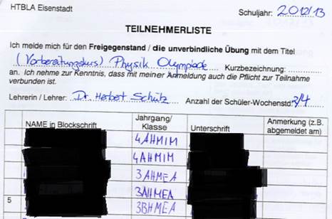 So lautete Ihre Beantwortung ua, dass an der HTL Eisenstadt bei der Anmeldung für unverbindliche Übungen und Freigegenstände keine Unterschriftenlisten zur Anwendung kommen, was – wie der folgende Ausschnitt der geschwärzten Unterschriftenliste zeigt – eindeutig unrichtig ist.