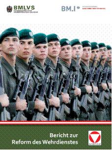 Der „Bericht zur Reform des Wehrdienstes“, herausgegeben von: „Republik Österreich /Bundesminister für Landesverteidigung und Sport, BMLVS, Roßauer Lände 1, 1090 Wien“, scheint, wie dem Deckblatt zu entnehmen ist, in Kooperation mit dem Bundesministerium für Inneres gestaltet worden zu sein. Auf Seite 11 findet sich ein Vorwort des Klubobmannes des Parlamentsklubs der ÖVP Karlheinz Kopf.