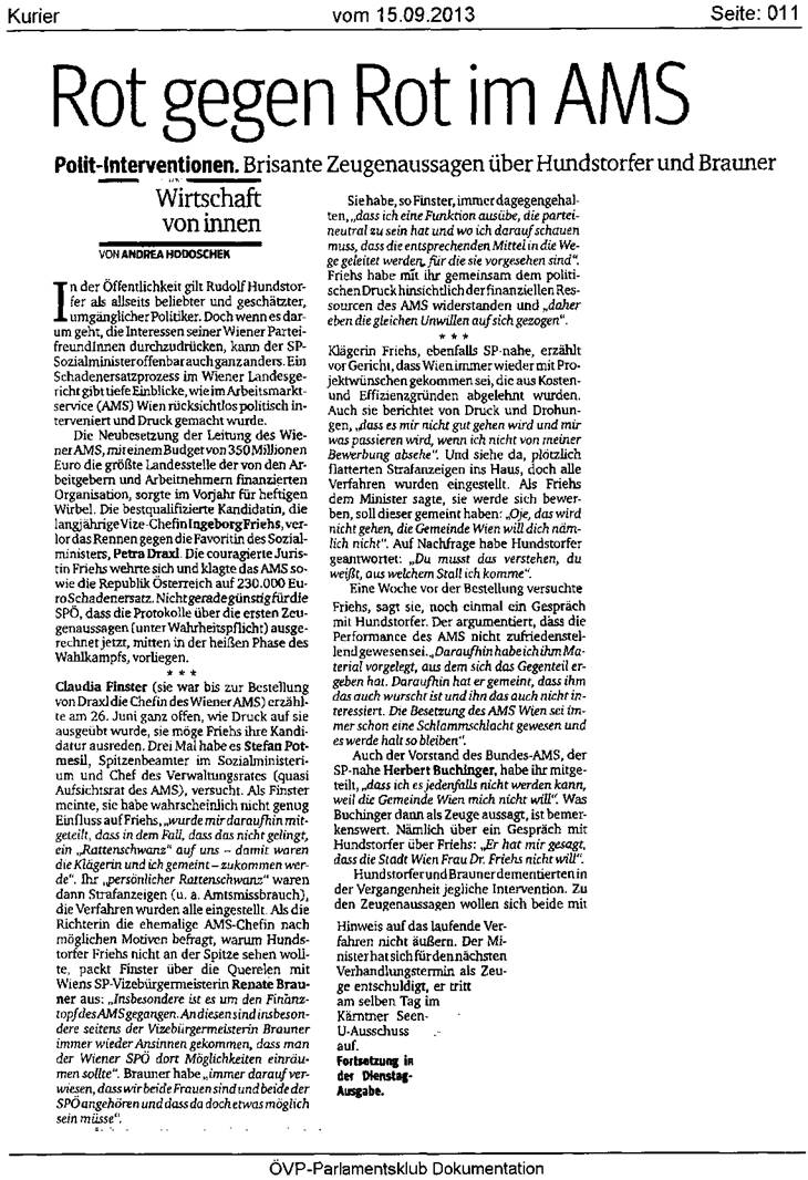 Am deutlichsten bestätigt das der Vorstand des Bundes-AMS Herbert Buchinger - übrigens ebenfalls SPÖ-Mitglied. Er gibt über ein Gespräch mit Hundstorfer zu Protokoll: „Er hat mir gesagt, dass die Stadt Wien Frau Dr. Friehs nicht will“.