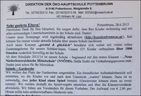 Am letzten Schultag des Sommersemesters 2013 wurde an die Schulkinder an der HS Pottenbrunn ein Zettel ausgeteilt, wonach es ab dem Wintersemester 2013/14 an der Schule Spindkästen geben soll, Kostenpunkt: 2,90 Euro/Monat, d.s. jährlich rd. 35 Euro. Abgesehen von diesen anfallenden Kosten ist nun auch noch die zusätzliche Einhebung einer Schlüsselkaution zu befürchten. Einige betroffene Eltern sind nun – wohl nicht ganz zu Unrecht – aufgebracht, warum keine Elternvertreter in eine allfällige Diskussion um die Anschaffung der Spindkästen eingebunden worden sind.
