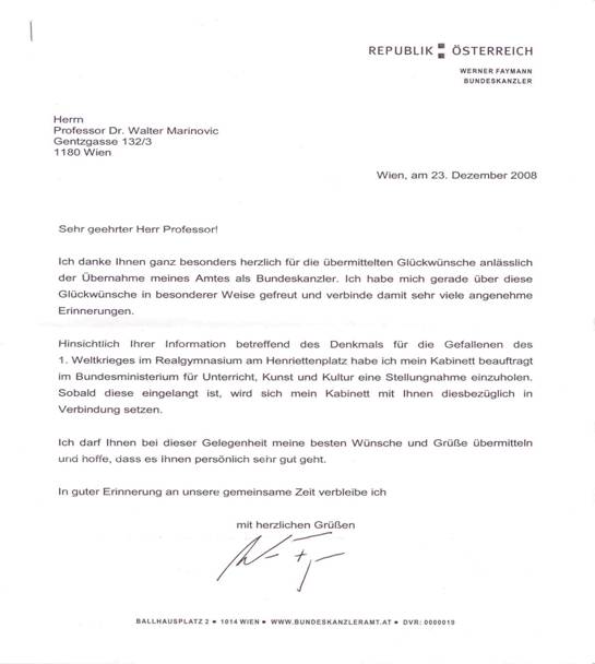 Ein Brief, datiert mit 23. Dezember 2008, (siehe Faksimile) wurde jedoch in einer sehr vertraulichen Art abgefasst. In diesem Schreiben wird vom Bundeskanzler im Besonderen auf „gemeinsame Erinnerungen“ mit Dr. Marinovic hingewiesen. Weiters erkundigte sich der Bundeskanzler über das allgemeine Wohlbefinden des Herrn Dr. Walter Marinovic.