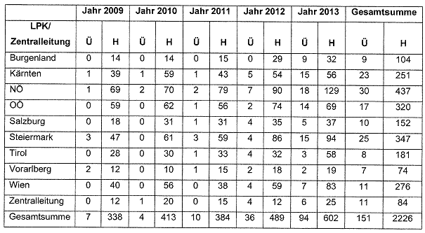 gesetzlichen Übertrittsalters (Ü) sowie aufgrund der Verlängerung der Hacklerregelung (H) in den Jahren 2009 bis 2013 zu erwartenden Ruhestände je Landespolizeikommando dargestellt. Ruhestände wegen Dienstunfähigkeit sind mangels Vorhersehbarkeit nicht umfasst.“