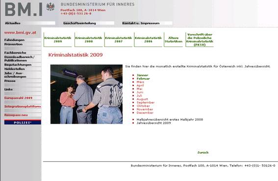 In der Radiodiskussion vom 29.4.2009 hat die Frau Bundesministerin für Inneres darauf hingewiesen weniger Anfragen zur Kriminalstatistik einzubringen und dafür die auf der Homepage des Bundesministeriums für Inneres verfügbare Kriminalstatistik zu verwenden. Doch dies ist nicht möglich, da die Kriminalstatistik für März 2009 Ende April noch nicht auf der Homepage verfügbar ist. (Screenshot vom 30.4.2009)