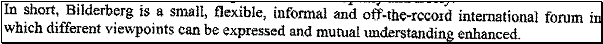 „Bilderberg ist, kurz zusammengefasst, ein kleines, flexibles, informelles und inoffizielles internationales Forum in welchem verschiedene Gesichtspunkte vertreten werden können und in dem gegenseitiges Verständnis gefördert werden soll.“