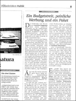In den „Oberösterreichischen Nachrichten“ vom 27. Juni 2009 findet sich auf Seite 5 in einem Artikel mit dem Titel „Ein Budgetstreit, peinliche Werbung und ein Paket“ die Schilderung, wie die ÖVP Oberösterreich offensichtlich Schüler und Schulleiter für eine eigene Wahlkampfveranstaltung einspannen will: