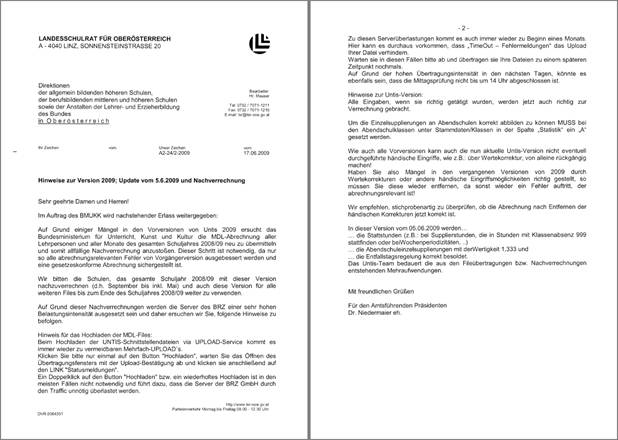 In einem Rundlauf-Erlass vom 17. Juni 2009 verständigt der Landesschulrat für Oberösterreich Allgemein bildende Höhere Schulen (AHS), Berufsbildende Mittlere und Höhere Schulen (BMHS) und Anstalten der Lehrer und Erzieherbildung davon, dass im Zuge eines Updates am 5. Juni 2009 der in diesen Schulen verwendeten administrativen Software „UNTIS“ Neuberechnungen („Nachverrechnung“) der MDL-(= Mehrdienstleistungen)-Abrechnungen des verstrichenen Schuljahres 2008/09 erforderlich geworden sind.