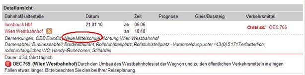 Seit der letzten Fahrplanänderung der ÖBB im Dezember 2009 verkehrt täglich auf der Strecke Innsbruck – Wien der Zug OEC 765 „Neue Mittelschule“ (im Folgenden NMS genannt) mit Abfahrt um 6.06 Uhr in Innsbruck und Ankunft um 10.40 Uhr in Wien.
