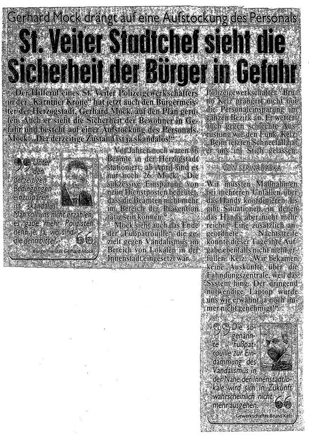 Ein Bericht der "Kärntner Kronen Zeitung" vom 14. März 2010 wegen der prekären Personalsituation in der Polizeiinspektion Sankt Veit an der Glan (siehe Beilage) sorgt derzeit für Aufregung in der Bevölkerung. In diesem Zeitungsbericht wird unter anderem behauptet, dass die Zahl der ExekutivbeamtInnen an der Dienststelle Sankt Veit an der Glan in den letzten Jahren von 36 auf 26 reduziert wurde. Präventive Tätigkeiten durch die Exekutive seien durch diese drastische Personalreduktion nicht mehr möglich, berichtet der Sankt Veiter Bürgermeister Gerhard Mock. Auch ein in der Polizeiinspektion Sankt Veit an der Glan tätiger Polizei-Gewerkschafter schlägt in diesem Bericht Alarm. Er bemängelt insbesondere die schlechte Ausrüstung an seiner Dienststelle. So funktioniere etwa das derzeitige Dienstfunksystem bei starkem Schneefall nicht mehr. Auch ein für die Fahndungsarbeit dringend notwendiger Laptop wurde seitens des Innenministeriums noch immer nicht genehmigt. Durch den starken Personalabbau in der Polizeiinspektion Sankt Veit an der Glan in den letzten Jahren, verbunden mit groben Missständen beim technischen Gerät, scheint die Sicherheit der Bürgerinnen und Bürger in dieser Stadt jedenfalls nicht mehr ausreichend gewährleistet zu sein. Es besteht dringender Handlungsbedarf.