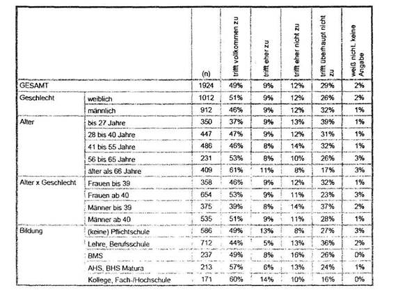 49 % der Befragten, diese Aussage träfe vollkommen zu, 9 % meinten eher,