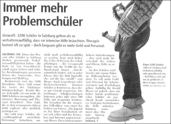Die "Salzburger Nachrichten" berichten in ihrer Ausgabe vom 05. Mai 2010 von einer steigenden Zahl an verhaltensauffälligen Schülern.