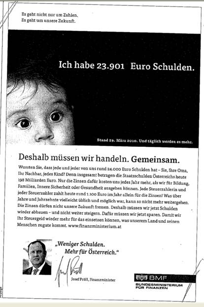 Richtigerweise hätten die Bürger vorher gefragt werden müssen, ob sie die Schulden mittragen wollen, statt nachher als Verantwortlicher in der Regierung die Menschen aufzuklären, wie hoch nun die Schuldenlast jedes Einzelnen ist. Der Finanzminister hat die Menschen auch nicht gefragt, ob sie die Banken gerettet werden sollen und ob die 100 Milliarden für das Bankenrettungspaket in Ordnung gingen. Zuerst sagte Gusenbauer, dann Molterer und Pröll, dass das Bankenrettungspaket ein Geschäft für die Republik wäre. Hinterher hat sich aber herausgestellt, dass diese Aussagen ein einziges Täuschungsmanöver waren. Die Zeche dafür zahlt aber einmal mehr der Steuerzahler. Wie auch für diese Inseratenkampagne.