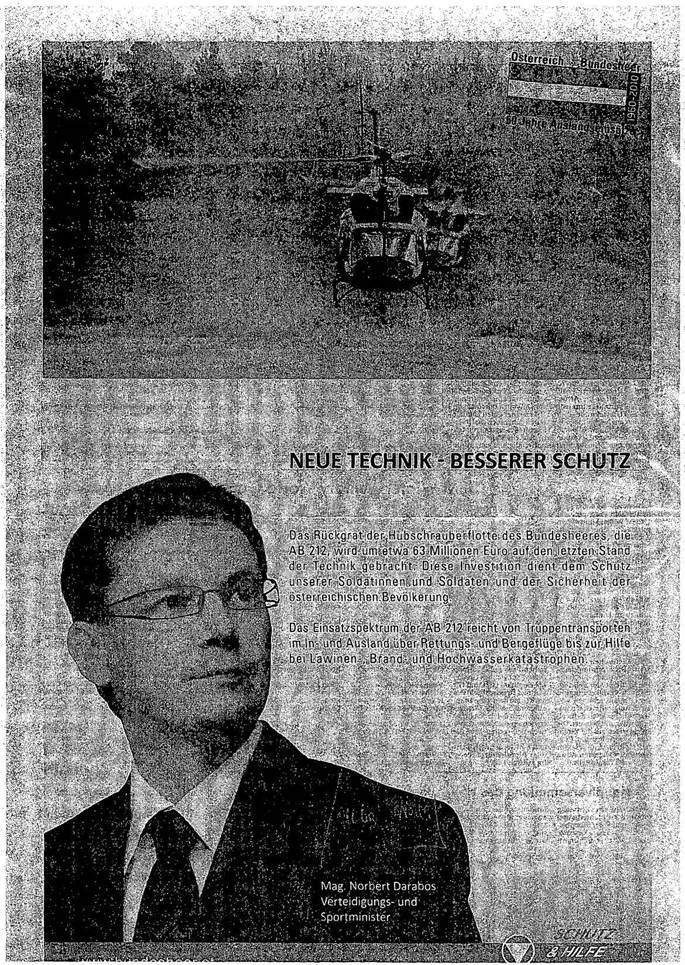 Betrachtet man allerdings nunmehr Inseratschaltungen des Bundesministeriums für Landesverteidigung und Sport wie zum Beispiel in der Zeitschrift „DER SOLDAT” vom 28. April 2010, auf der Seite 16, (siehe in der Beilage) so muss eine grobe Missachtung dieser Richtlinien konstatiert werden. Dieses Inserat erstreckt sich über eine ganze Seite im 4-Farb-Druck, die eine Hälfte nimmt das Foto des amtierenden Verteidigungsministers ein, die andere Hälfte ist ein Foto von Hubschraubern. Der Sachinhalt tritt gegenüber diesen beiden großen Fotosujets, mit 2 kurzen Absätzen, in den Hintergrund.