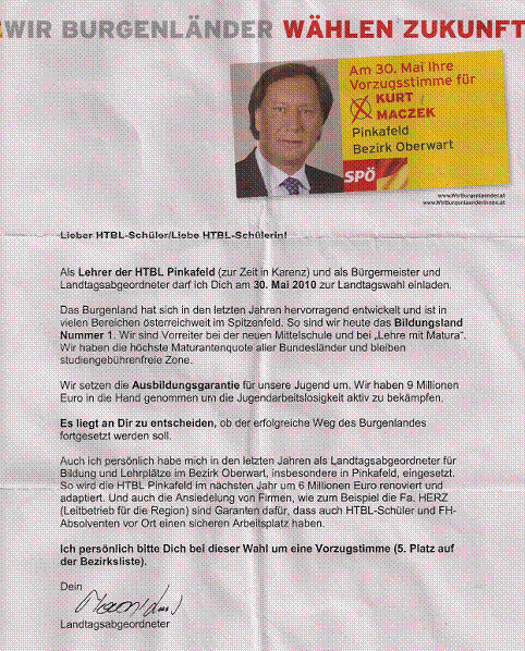 Im Rahmen der burgenländischen Landtagswahl hat ein Kandidat der SPÖ einen Brief offenbar an die Schüler der HTBL Pinkafeld geschrieben, in welchem er sich als karenzierter Lehrer eben dieser Schule vorstellt und gleichzeitig auffordert, ihm eine Vorzugsstimme für die Landtagswahl zu geben.