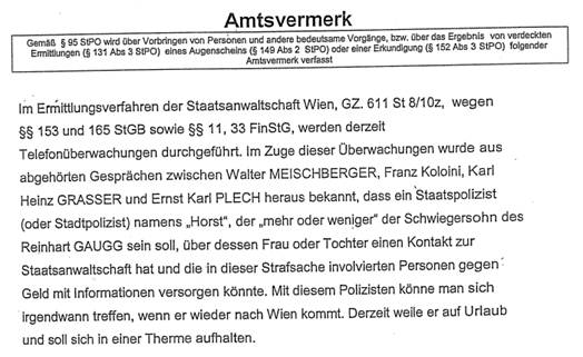Verlässliche vertrauliche Quellen (vgl Amtsvermerk) dokumentieren Gespräche zwischen Walter Meischberger, Ernst Karl Plech und Karl Heinz Grasser u.a., in denen von Seiten der Beteiligten das Vorhaben geäußert wurde, ein Mitglied der Exekutive des Vertrauens, ev. aus FPÖ-nahen Kreisen, soll gegen Bezahlung bei der Staatsanwaltschaft oder anderen in der Causa BUWOG tätigen Behörden Informationen über den Ermittlungsstand beschaffen.