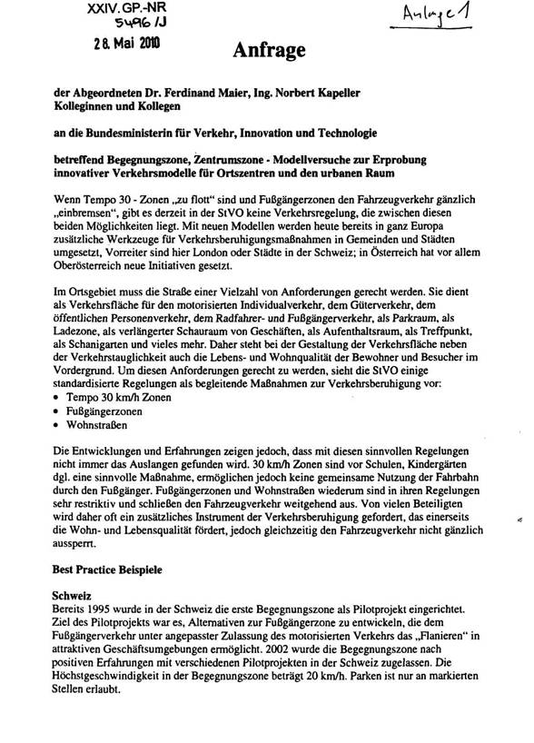 Am 28.05.2010 hat der erstzeichnende Abgeordnete die schriftliche parlamentarische Anfrage 5496/J der Abgeordneten Dr. Ferdinand Maier, Kolleginnen und Kollegen an die Bundesministerin für Verkehr, Innovation und Technologie betreffend Begegnungszone, Zentrumszone - Modellversuche zur Erprobung innovativer Verkehrsmodelle für Ortszentren und den urbanen Raum eingebracht (Anlage 1).