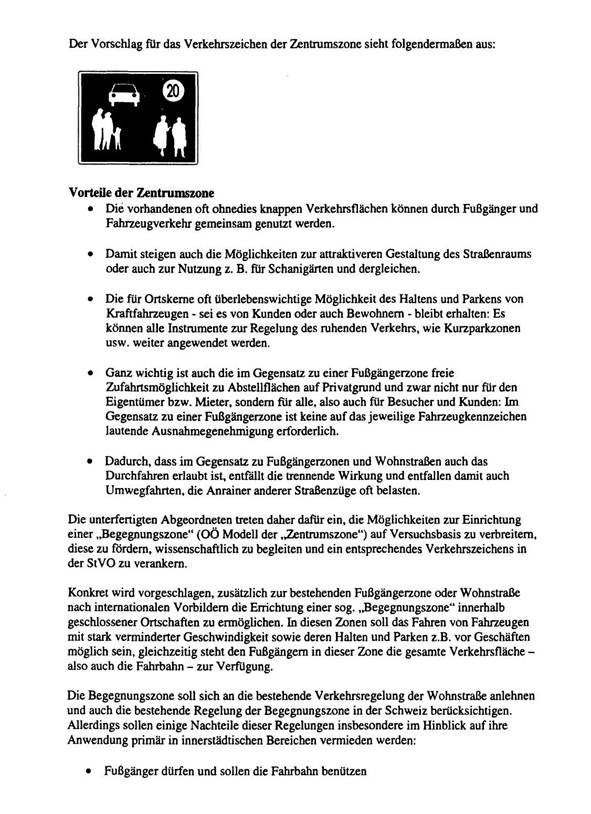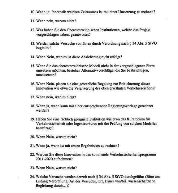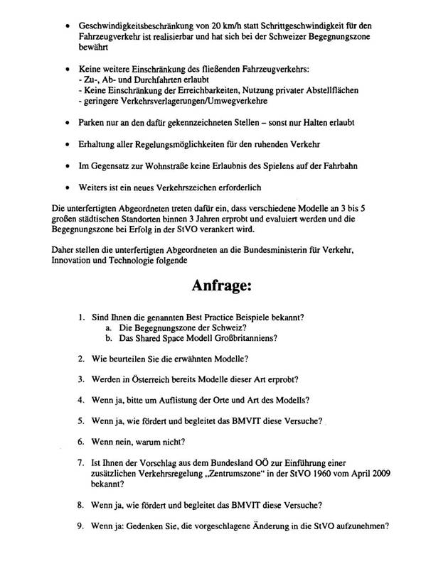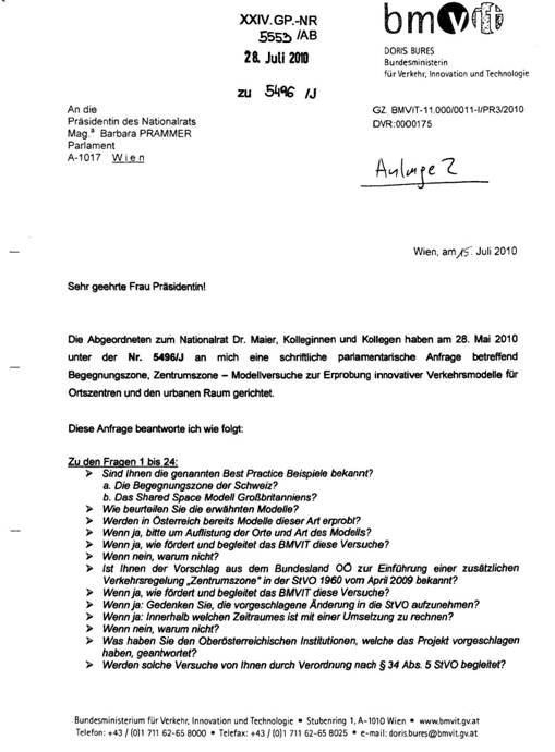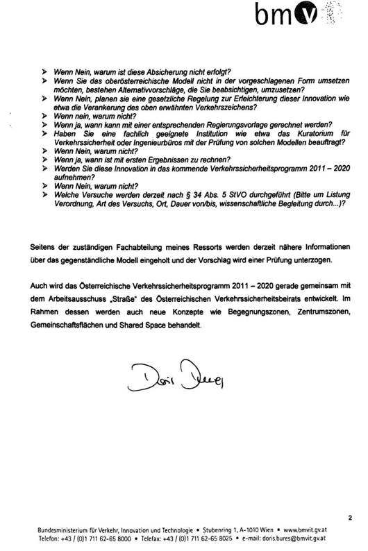 Die 24 sachlichen Fragen wurden 2 Monate später mit 3 kurzen Sätzen beantwortet (5553/AB, Anlage 2), was nur zum Teil darauf zurück zu führen sein kann, dass es im BMVIT kaum oder gar keine Überlegungen zu innovativen Verkehrsmodellen für Ortszentren und den urbanen Raum gibt. Die StVO liegt zweifellos in der Vollziehung des BMVIT und dennoch blieb die Frage unbeantwortet, welche Versuche derzeit nach § 34 Abs. 5 StVO durchgeführt werden.