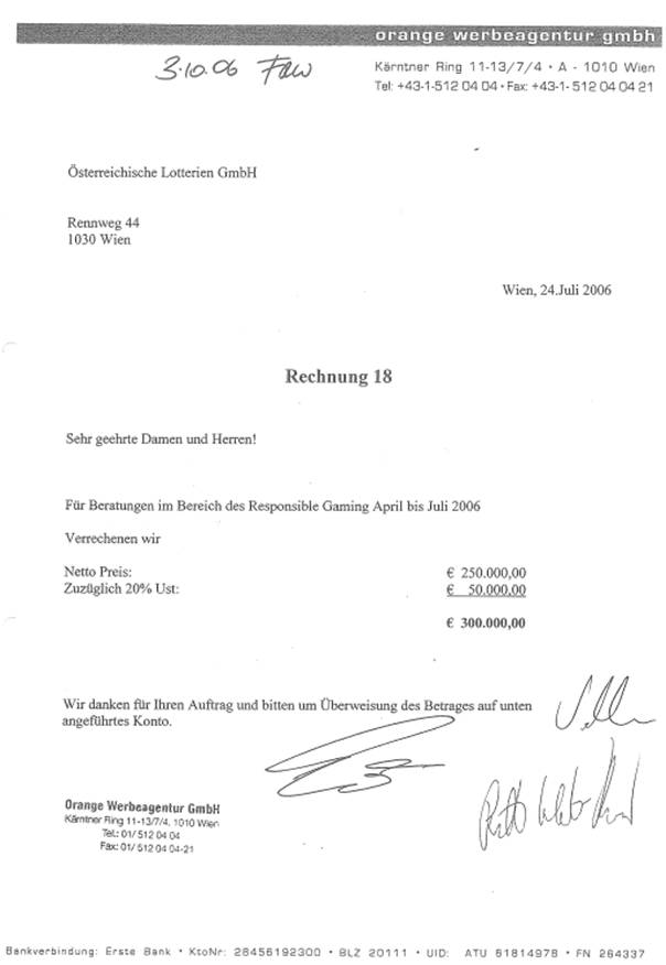 Dementsprechend verrechnete am 24.7.2006 die im Eigentum des BZÖ stehende Orange Werbeagentur GmbH, FN 264337 an die Österreichische Lotterien GmbH einen Betrag von Euro 300.000 für „Beratungen im Bereich des Responsible Gaming April bis Juli 2006“ mittels folgender Rechnung: