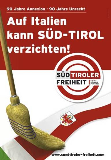 Stein des Anstoßes ist die Abbildung eines Besens auf den Plakaten, der die italienische Fahne vor sich herschiebt und eine weiß-rote Tiroler Spur nach sich zieht. „Damit wollen wir zum Ausdruck bringen, dass sich Italien aus Südtirol zurückziehen soll: 90 Jahre sind genug,“ so Klotz.