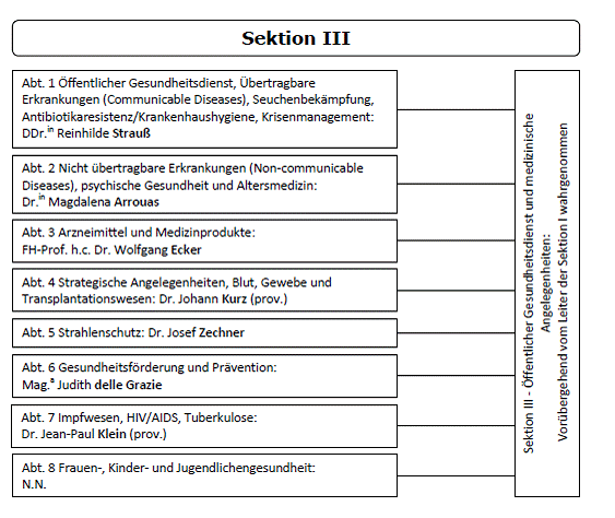 Grundsätzlich gliedert sich das Bundesministerium für Gesundheit in drei Sektionen, welche wiederum in Abteilungen unterteilt werden. Dieser generelle Aufbau wird in der nachfolgenden Abbildung anhand der Sektion III des BMG exemplarisch dargestellt.