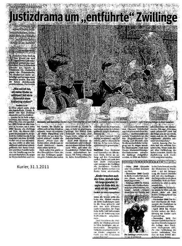Seit Dezember 2008 befindet sich Coralie B. mit ihren zwei Söhnen Alexander und Maximilian in Österreich (siehe Bericht Kurier vom 31.1.2011). Nach ihrer Flucht aus Frankreich vor ihrem gewalttätigen Ex-Lebensgefährten und Vater ihrer Zwillinge möchte sie hier wieder ein normales Leben führen. Doch noch ist nicht gesichert, ob sie mit ihren Kindern in Österreich bleiben darf. Die inhaltliche Richtigkeit des zitierten Berichts vorausgesetzt, wurden die Kinder in Frankreich während der Abwesenheit der Mutter vom Vater missbraucht, von ihm sogar in ein Haus gebracht, in dem sie von zwei Männern nackt fotografiert wurden. Zwei Gutachter bestätigen in Wien "ein offensichtliches übergriffiges Verhalten des Vaters". Dennoch entschied der OGH, dass die Kinder aufgrund des Haager Kindesentführungsübereinkommens nach Frankreich zurückgeführt werden müssen.