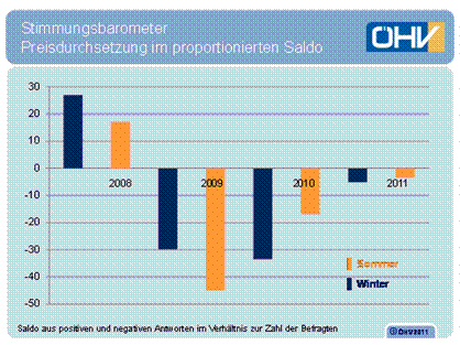 Während die ohnehin bereits angeschlagenen Betriebe bei den Umsätzen weiterhin ein Minus von 5% zu verzeichnen haben, hört man aus dem Ministerbüro von der Erholung der Tourismusbranche nach der Krise und von Rekordergebnissen bei Inländernächtigungen und -ankünften im Jahr 2010 sowie einer stabilen Nachfrage auf ausländischen Herkunftsmärkten. Doch wie das Stimmungsbarometer der ÖHV zeigt, ist trotz (notwendiger) Besserung der Saldo aus positiven und negativen Antworten bei der Preisdurchrechnung immer noch negativ. Für die angeschlagenen Betriebe bedeutet das keine Verbesserung der ohnehin angeschlagenen Lage.