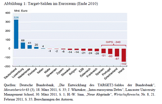 Für Österreich wird dabei per Ende 2010 ein negativer Target-Saldo in Höhe von 24 Milliarden Euro ausgewiesen.