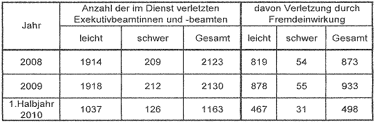 1. Wie viele Exekutivbeamte wurden im Jahr 2010 und 2011 im Dienst verletzt?