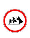 Schild: Auf einer quadratischen Schilderfläche mit weißem Grund ist ein roter Kreis mit schwarzer Umrandung vorhanden, der auf ein Verbotsschild nach der StVO abstellt. Im Kreisinneren dieses „Verbotsschildes“ wird ein muslimischer Kleriker und mit Turban am Kopf dargestellt, welcher zwei Jugendliche mit ausgestreckten Armen vor sich hertreibend verfolgt.
