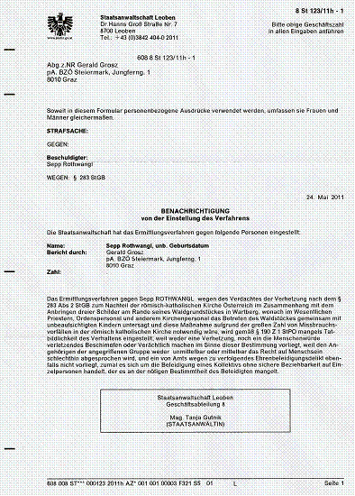 Mai 2011 bei der Staatsanwaltschaft Leoben gegen Herrn Sepp Rothwangl eine
