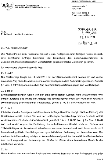 Die Antwort der Bundesministerin für Justiz erfolgte am 29. Juli 2011: