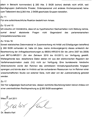 Mit dieser Interpretation des Gesetzes stellt die Bundesministerin fest, dass es sich bei katholischen Geistlichen um „Berufsgruppen“ handelt, welche vom Schutz des „Verhetzungsparagraphen“ § 283 StGB ausgenommen sind.