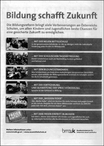 betreffend "Bildung schafft Zukunft", Inserat des BMUKK in "Beste Seiten" zur Buch Wien 11
