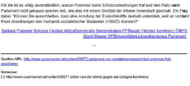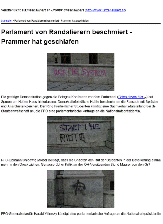 Zu den Beratungen der Bologna-Konferenz waren Parlamentsabgeordnete nicht zugelassen, wie das Wissenschaftsministerium dem Wissenschafts-ausschussobmann Dr. Martin Graf und Kollegen unmissverständlich mitteilte. Dafür hatten die Damen und Herren Abgeordneten. am 11. März in der Zeit von 18:30 bis 19:30 Uhr vom Parlament aus einen schönen Überblick über die wütenden Demonstranten, die das Hohe Haus ins Visier nahmen. (siehe beigefügten Medienbericht von www.unzensuriert.at)