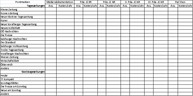 7.) Um das Kostenbewusstsein im Hause allgemein zu fördern haben wir in der Anlage eine Auflistung der gängigsten Printmedien von Tageszeitungen, Gratiszeitungen, Wochenzeitungen, Magazinen, Fachpresse und ausländischer Presse aufgelistet. Wir ersuchen um Mitteilung der Anzahl der Bezieher und Bezieherinnen sowie der Kosten pro Jahr in den Bereichen Mediendokumentation, Präsident des Bundesrates, Präs des Nationalrates, II. Präsident des Nationalrates, III. Präsident des Nationalrates sowie der Parlamentsdirektion.