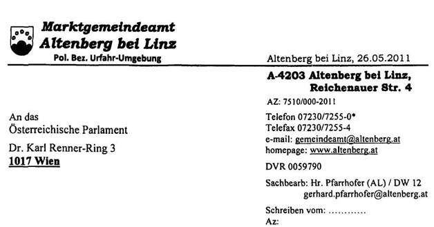 Die Marktgemeinde Altenberg bei Linz hat sich entschlossen, sich dem vielseitigen Begehren über einen weltweiten Atomausstieg anzuschließen und unterstützt daher die Petition der Umweltschutzorganisation GLOBAL 2000. Die Petition wurde in der Sitzung des Gemeinderates am 04. Mai 2011 beschlossen und die Bundespolitik wird damit aufgerufen, sich für einen europa- u. weltweiten Atomausstieg einzusetzen.