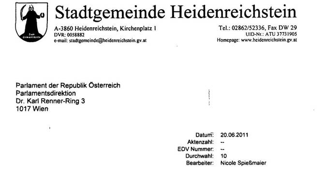Der Gemeinderat der Stadtgemeinde Heidenreichstein hat in seiner Sitzung am 25.05.2011 die „Petition zum weltweiten Atomausstieg" sowie die Resolution „Mehr Energie-Effizienz und Ausbau der erneuerbaren Energie" beschlossen.