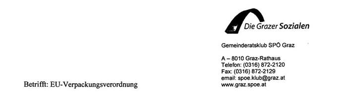 In der Anlage überreiche ich Ihnen gemäß § 100 (1) GOG-NR die vom Grazer Gemeinderat samt einem Zusatzantrag einstimmig beschlossene Petition betreffend „Gegenmaßnahmen zur EU- Verpackungsverordnung“.