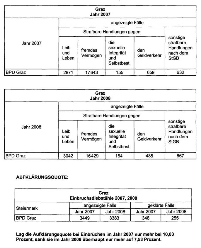 Die ersten Zahlen der Kriminalitätsstatistik für Jänner/Februar 2009 zeigen zudem einen deutlichen Anstieg der Kriminalität. So ist die Zahl der angezeigten strafbaren Handlungen in Graz in den ersten Monaten 2009 bereits um 3,4 Prozent gestiegen. Die Einbruchskriminalität ist diesem Zeitraum bereits um 6 Prozent gestiegen, die Aufklärungsquote laut Innenministerium um unfassbare 33,8 Prozent zum Zeitraum des Vorjahres gesunken. In Graz werden überhaupt nur mehr 5 Prozent der Einbrüche geklärt!