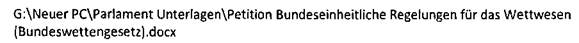 Gemäß § 100 Abs. 1 GOG-NR überreiche ich Ihnen die Petition betreffend „Bundeseinheitliche Regelungen für das Wettwesen (Bundeswettengesetz)“ mit dem Ersuchen um geschäftsordnungsmäßige Behandlung.