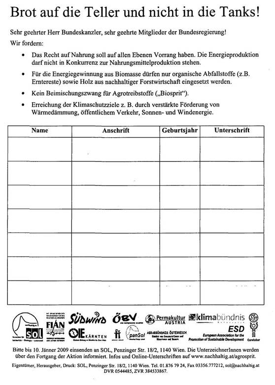 Gemäß § 100 Abs. 1 GOG-NR überreichen wir die Petition betreffend „Brot auf die Teller und nicht in die Tanks!" mit dem Ersuchen um geschäfts-ordnungsmäßige Behandlung. Hauptträger der Petition ist,die Initiative SOL, 1140 Wien, www.nachhaltig.at