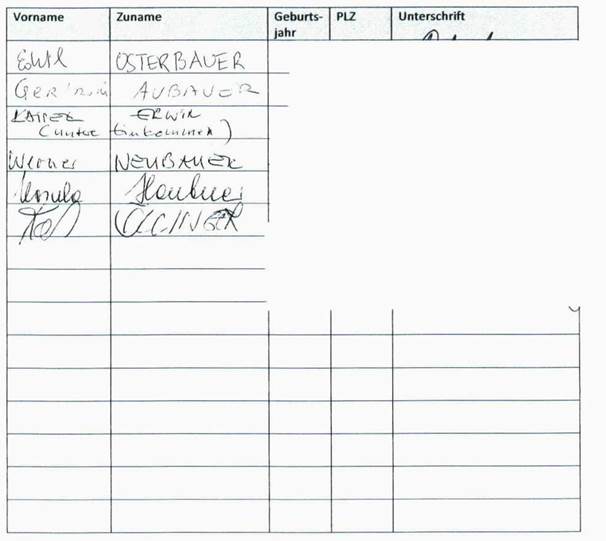 Die unterfertigte(n) Person(en) unterstützen mit ihrer eigenhändigen Unterschrift alle Maßnahmen des