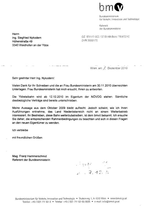 o Welche Bedeutung das BMVIT der Ybbstalbahn zumisst, ist daran ersichtlich, daß man nach wie vor bereit ist 10 Mio. Euro für die Sanierung der Altlasten zu geben, so das Land NÖ will! (Beilage)