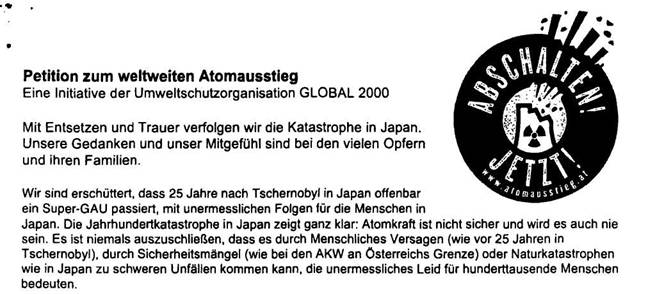 Man sollte bedenken, dass es zurzeit keine ausreichenden Alternativen für Atomstrom gibt und man derzeit nur die Plattform GLOBAL 2000 mit einer derartigen Petition unterstützt.